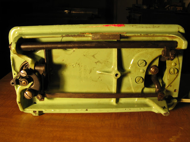 The Singer 185K I recently acquired was my first of this type. Normally a sewing machine has feet so it can stand on it's own, but this 185K doesn't have feet at the left (bobbin) end, so a large screw on the oscillating assembly rubs on the table when the machine is running.