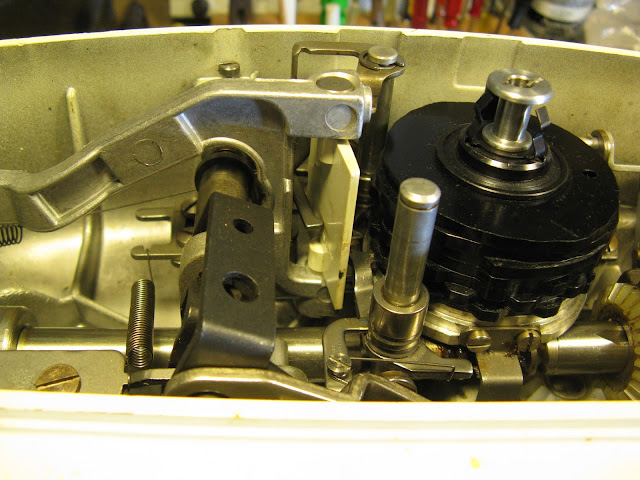 Here's where a lot of people get hung up on these machines. The 630 has plastic gears (seen below near the center of the photo) that run the intermediate shaft between the upper main shaft the the lower shaft under the machine bed. I'll have to admit, if any of the four gears were broken, this machine would probably be destined for the dump. Some of the gears are easier to replace, but the ones that fit onto the two horizontal shafts would be a major undertaking to replace.