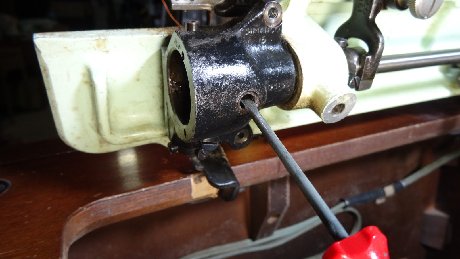 It's a little difficult to see here, but the hook point is directly behind the needle. Now tighten the two set screws on the hook.